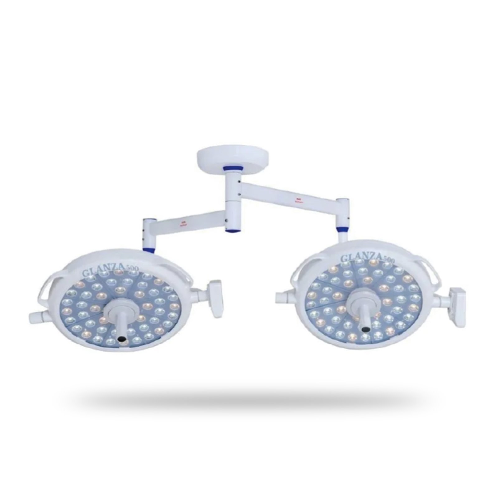 The GLANZA 500+500 OT Light is a twin-dome LED surgical lighting system designed to provide optimal illumination during medical procedures. Each dome is equipped with advanced LED technology, ensuring consistent and shadow-free lighting in the operating theater.